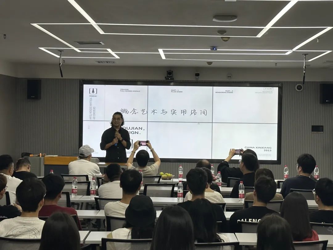 本次论坛活动的重点环节是设计分享会。第一位主讲嘉宾是有间设计工作室创始人、设计总监董新建,分享的题目是《设计·生活——概念艺术与实用空间》。他提出:设计是把一种计划、规划、设想等通过视觉的形式传达出来的活动过程,设计过程中,要体现出人们的生活节奏、生活理念的变化,艺术性要在满足其功能性基础上来体现。
