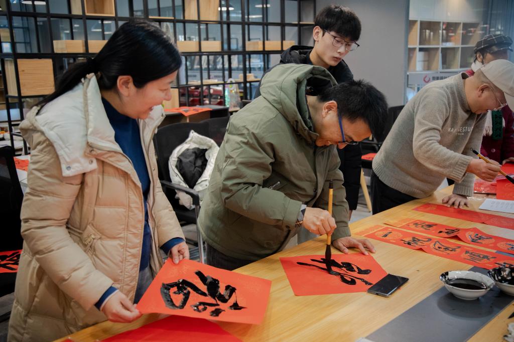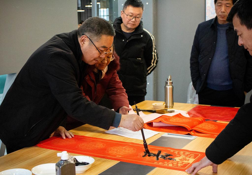 教职工们围在书桌旁,一边欣赏着书法创作的过程,一边品评春联内容,不时发出阵阵赞叹声。大家有序地挑选着自己心仪的春联,现场气氛热烈而欢快。老师们说道:“这手写的春联比买的更有年味儿,感觉把福气都写进字里了,特别有意义。”
