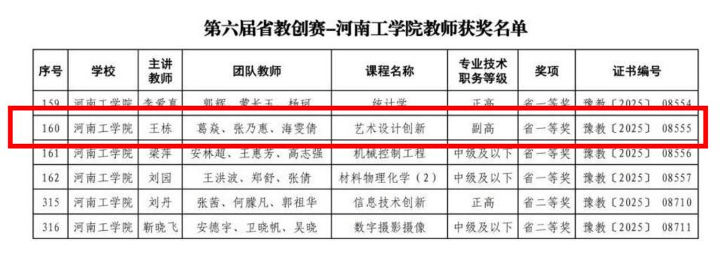 近日,河南省教育厅公布了第六届河南省本科高校教师课堂教学创新大赛获奖名单,我院王栋带领的课程团队《艺术设计创新》凭借扎实的教学功底和创新的教学理念脱颖而出,获得一等奖。